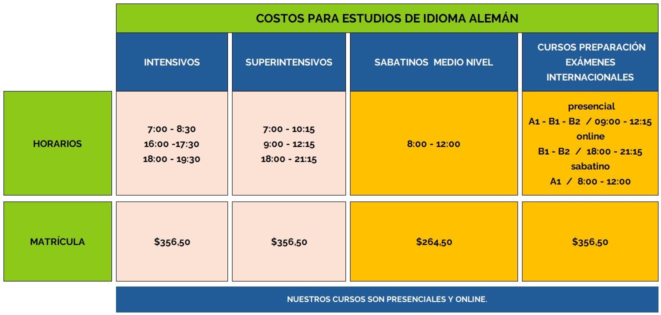 El Instituto ofrece cursos intensivos, superintensivos y sabatinos. Para los alumnos con excelente rendimiento, otorga becas del Instituto Goethe para estudios del idioma en Alemania.